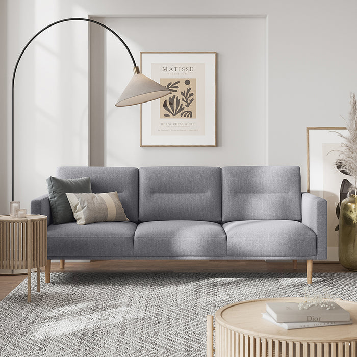 3 Seater Sofa in Soul Grey with oak legs. A modern inspired design, kept sleek and angular with slim legs. Comfort has not been sacrificed for design, with its comfy back cushions and wide armrests. All together the perfect and stylish place to spend your evenings.