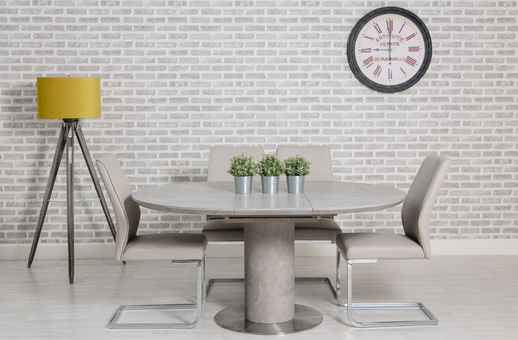 - Extension Dining table / Melamine concrete board / Brushed stainless steel base